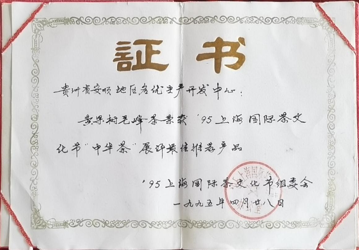 黃果樹毛峰茶榮獲95上海國際茶文化節(jié)“中華茶”展評最佳推薦產(chǎn)品