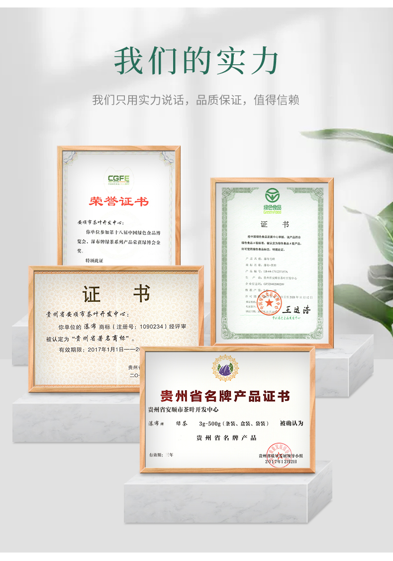 瀑布茶品牌是安順市人民政府主打茶葉品牌,省級重點打造區域公共品牌,屬貴州五大名茶,先后獲得獲“中國農產品區域公用品牌”、“貴州省著名商標”、“貴州省名牌產品”等榮譽稱號。近年來,在各級部門大力推動下,瀑布茶品牌不斷發展壯大。截止目前,現有瀑布茶品牌加盟企業23家,輻射茶園面積200000余畝,其中綠色食品認證茶園基地面積7000余畝,有機食品認證基地面積2500畝。擁有“瀑布毛峰”、“瀑布翠芽”“瀑布紅茶”、“瀑布翠龍”等產品,多次獲得“中綠杯”、“中茶杯”、“華茗杯”大獎;分別榮獲14屆中國國際農產品交易會金獎、18屆中國綠色食品博覽會金獎“黃山杯”首屆全國傳統名茶產品質量特別金獎、安順十大旅游商品等殊榮及稱號。
