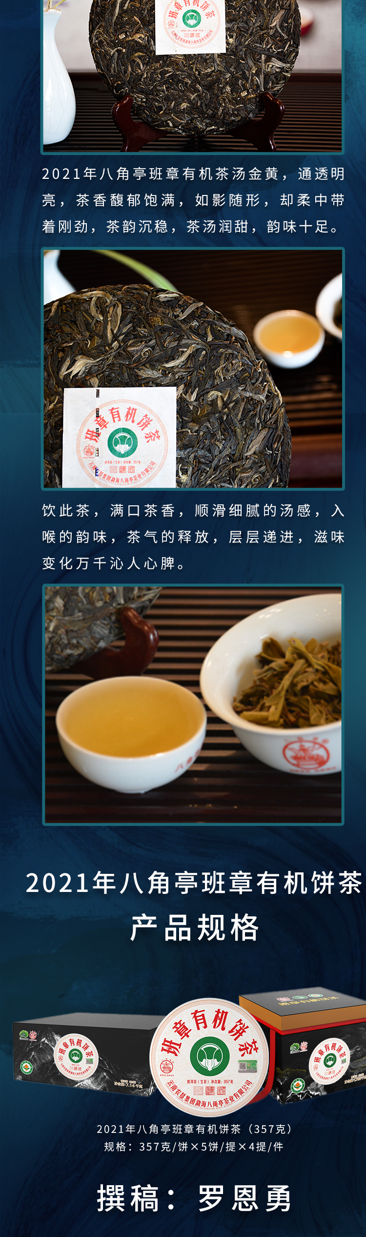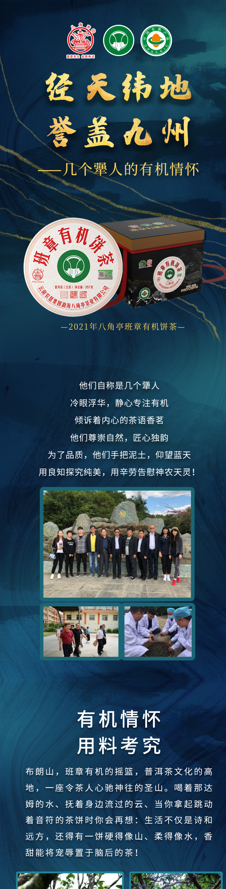 ??——八角亭茶業公司:經營方式為生產加工、銷售,主營普洱茶、緊壓茶、兼營毛茶收購。目前以生產、加工、銷售“八角亭”系列普洱茶為主,是云南省農業產業化龍頭企業?!鞍私峭ぁ鄙虡双@得云南省著名商標,“八角亭”牌普洱茶榮獲云南省名牌產品和云南省名牌農產品。已先后通過工業生產許可證、ISQ9001與HCCP認證、云茶牌認證(YC)等項工作,在歷次專業評比中“八角亭”普洱茶多次獲得特等金獎和金獎。2017年5月,“八角亭”牌老班章茶葉獲得了有機茶資格認證。八角亭茶業公司多次進行了技術改造,現已建立了標準化生產車間和設備,年設計生產量達3000噸,是整個公司的主體核心企業。