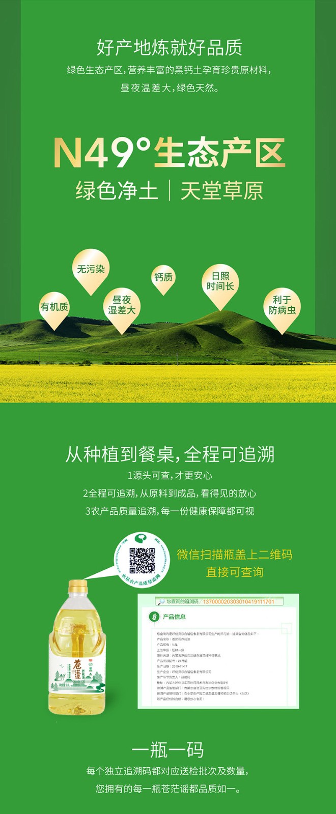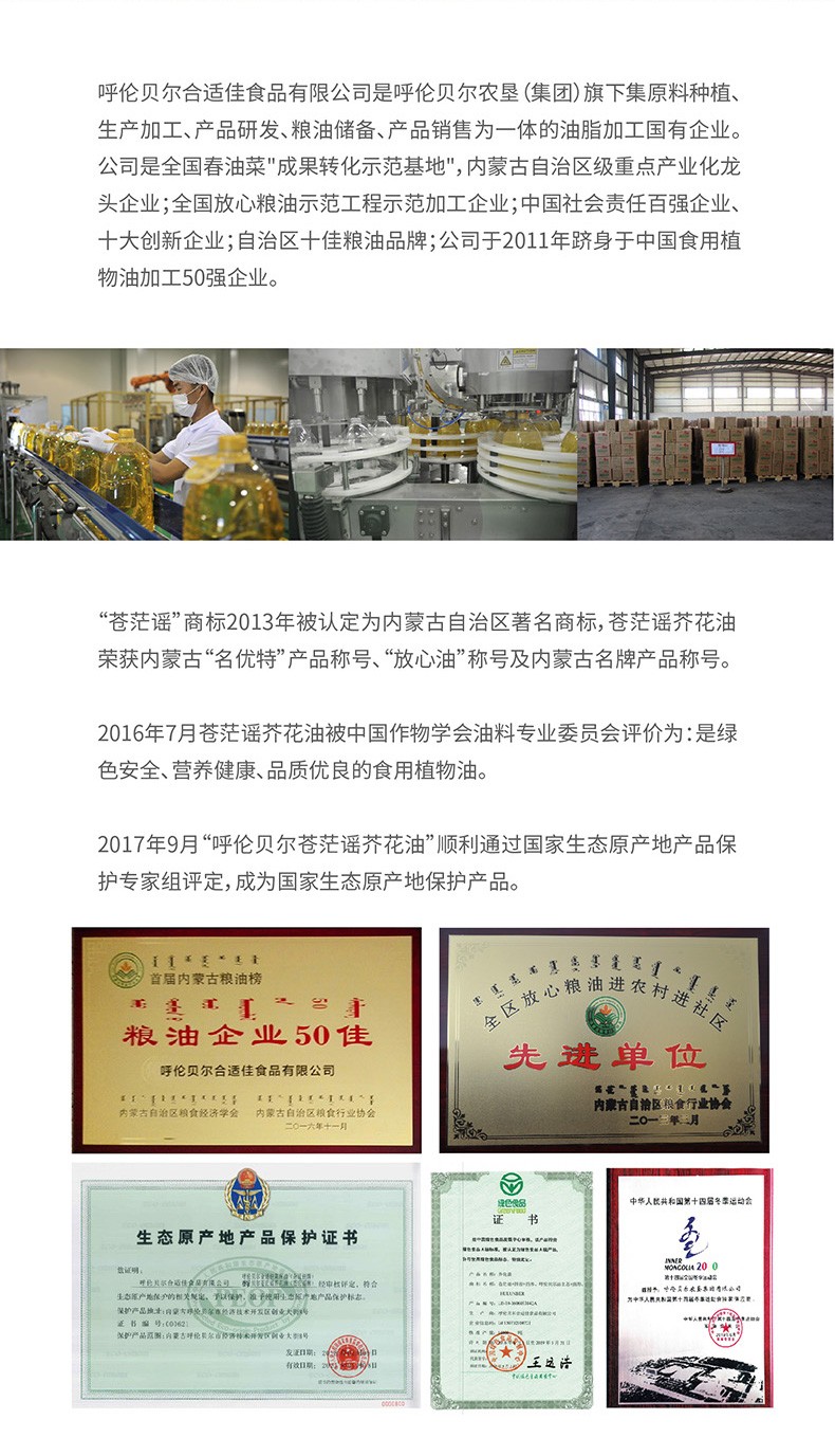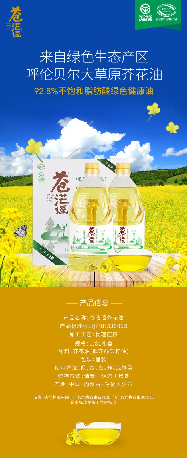 呼倫貝爾農墾出品蒼茫謠芥花油非轉基因菜籽油1.8L*2禮盒
